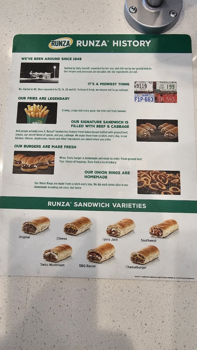 From a reviewer’s perspective, the menu at Runza Restaurant located at 3206 Broadway Ave, Yankton, SD, offers a well-rounded and satisfying snapshot of classic American fast-casual dining with a regional twist. The Legendary Burgers lineup stands out with hearty options like the Double Spicy Jack Burger, Bacon Cheeseburger, Double Hamburger Cheeseburger, and Swiss Mushroom Burger, all clearly designed for guests craving bold, familiar flavors. Chicken lovers are equally well served with items such as the Jr. Buffalo Chicken Wrap, Jr. Popcorn Chicken, BBQ Grilled Chicken Sandwich, Jr. Ranch Chicken Wrap, and Buffalo Grilled Chicken Sandwich, which provide variety without straying from comfort-food appeal. For those wanting a complete, convenient meal, the Combo Meals-including the Cheeseburger Combo Meal, Original Runza® Sandwich Combo Meal, Cheese Runza® Sandwich Combo Meal, Jr. Wrap Combo Meal, and Swiss Mushroom Runza® Sandwich Combo Meal-tie signature entrées neatly with sides and drinks. Lighter choices are represented through salads like the Side Salad, Southwest Chicken Salad, and Sweet Berry Chicken Salad, offering balance to the richer items. Classic Sides such as Frings™, Onion Ring, French Fry, and Side Salad complement any order, while families will appreciate the thoughtful Kids Meals options, including the Hamburger Kids Meal, Popcorn Chicken Kids Meal, Runza® Sandwich Kids Meal, Cheeseburger Kids Meal, and Chicken Strips Kids Meal. At the heart of the brand are the Runza® Sandwiches themselves-like the Spicy Jack Runza® Sandwich, Cheeseburger Runza® Sandwich, BBQ Bacon Runza® Sandwich, Original Runza® Sandwich, and Swiss Mushroom Runza® Sandwich-which anchor the menu’s identity. Smaller bites from the Snacks section, flavorful Sauces & Dip, refreshing Drinks, and classic Desserts such as the Ice Cream Cone, Chocolate Chip Cookie, and various Shakes round out the experience, making the menu feel complete, accessible, and consistently satisfying for a wide range of diners.